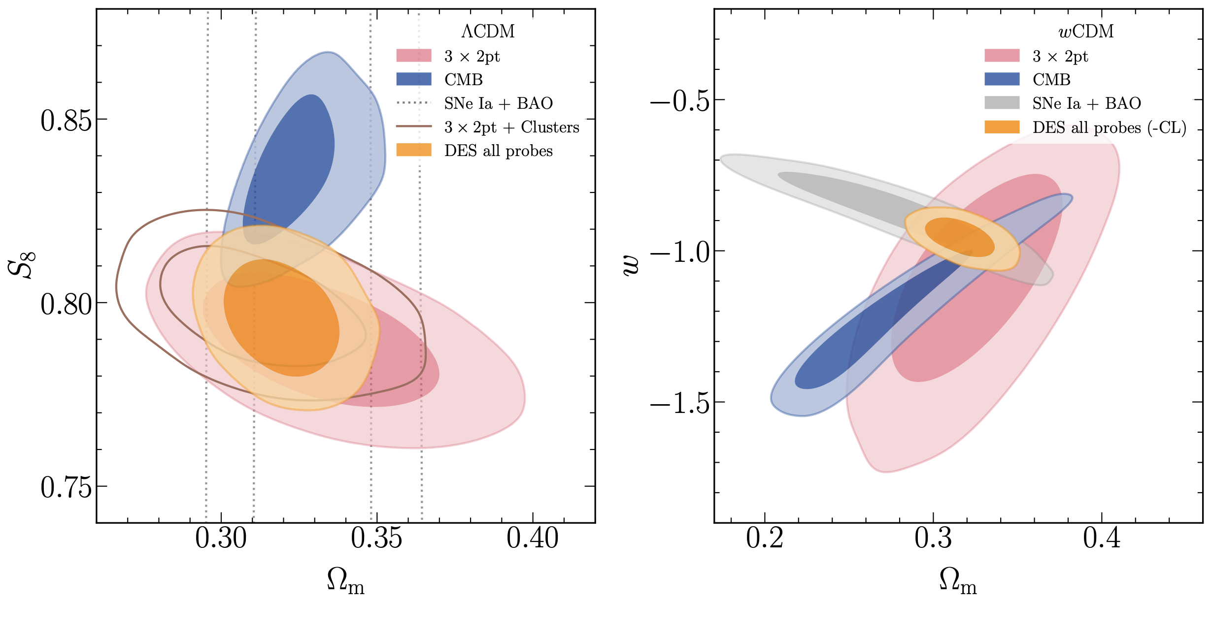 Cosmological constraints from the DES Year 6 dataset in ΛCDM (left) and wCDM (right). Shown are results from 3×2pt (pink), SNe Ia + BAO (black/gray), clusters + 3×2pt (brown), all DES probes combined (orange), and CMB from Planck+ACT+SPT (blue). For the first time, DES combined four independent dark energy probes from a single experiment, delivering constraints more than twice as strong as the previous analysis. The DES combination is consistent with the CMB at the 2.8σ level in ΛCDM and 2.5σ in wCDM.